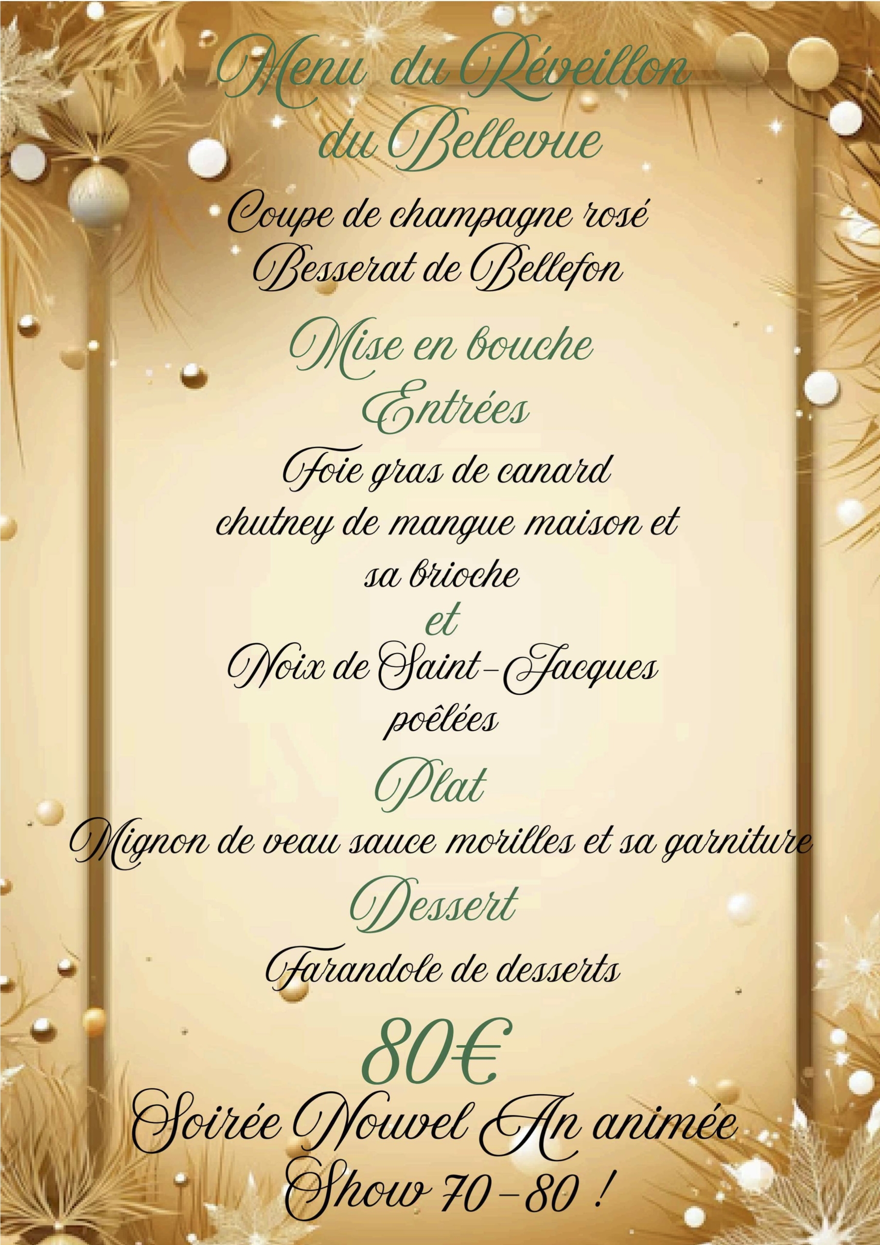 • L’entrée du moment ou Terrine de campagne / Filets de perche meunière ou Ballotine de volaille / Vacherin glacé ou Crème brulée